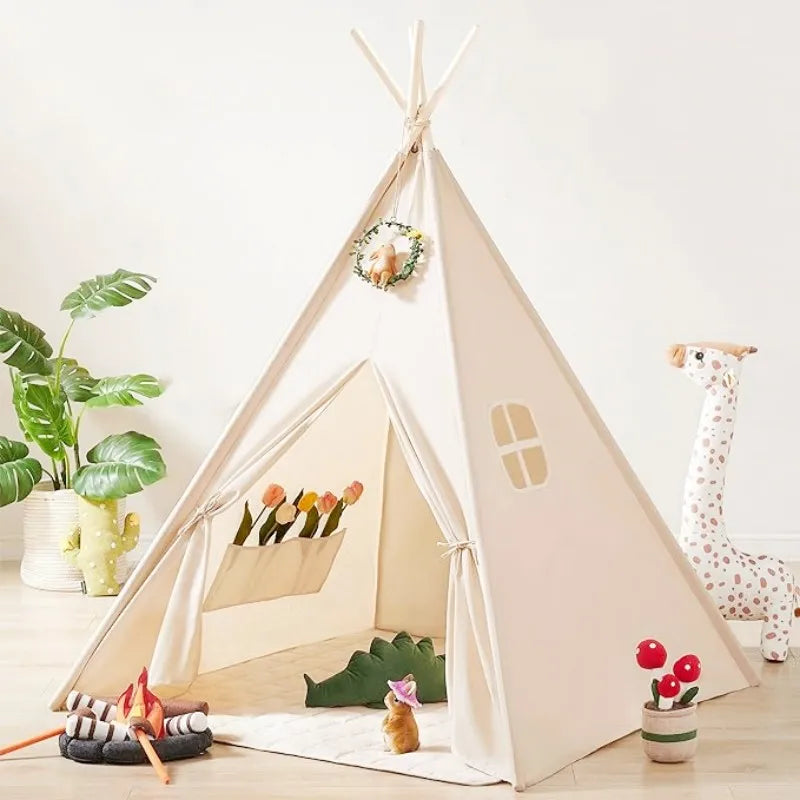 Des tipis pensés pour les enfants et pour demain : coton naturel, bois certifié, fabrication durable — un espace sain, sûr et magique.