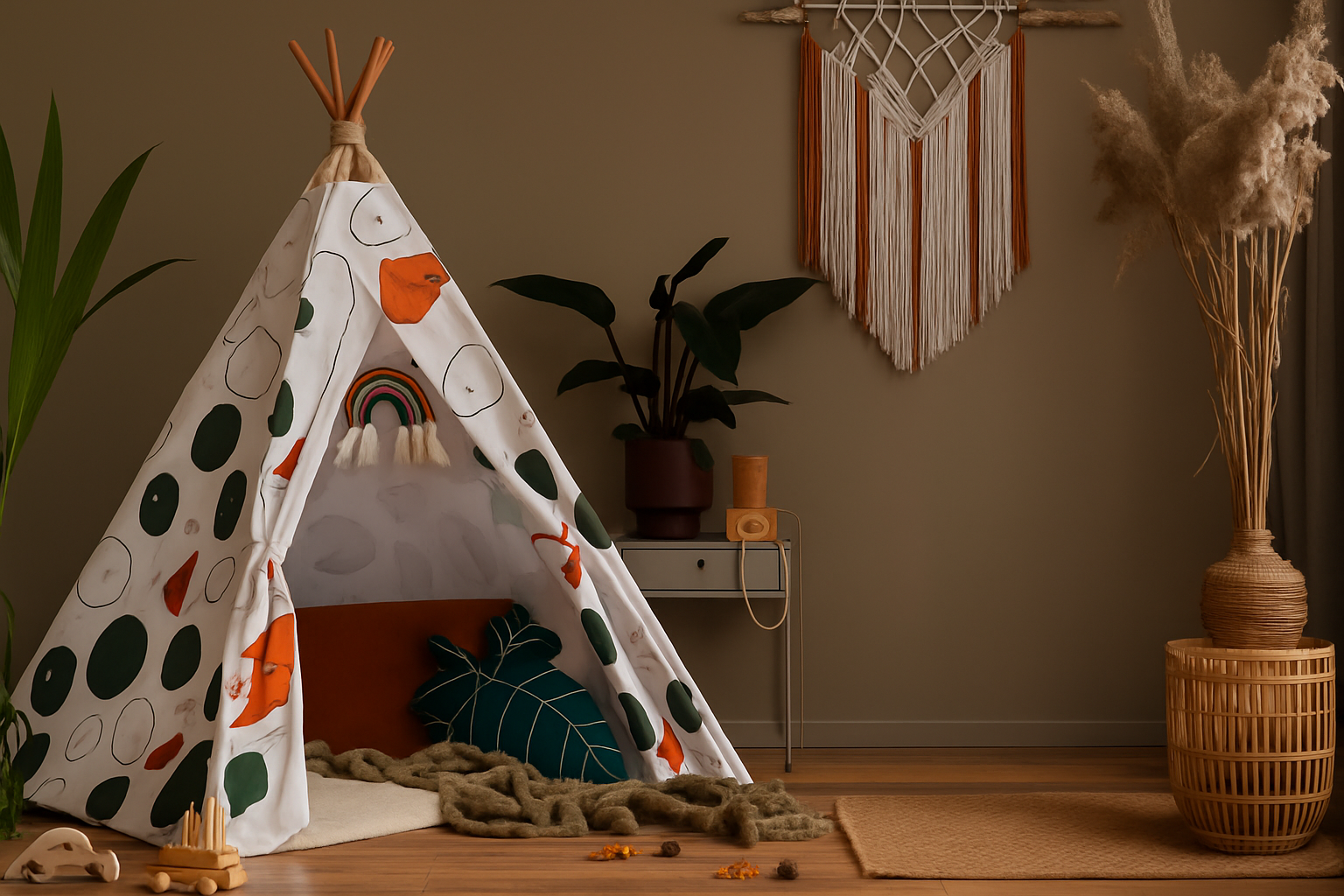 Des tipis pensés pour les enfants et pour demain : coton naturel, bois certifié, fabrication durable — un espace sain, sûr et magique.